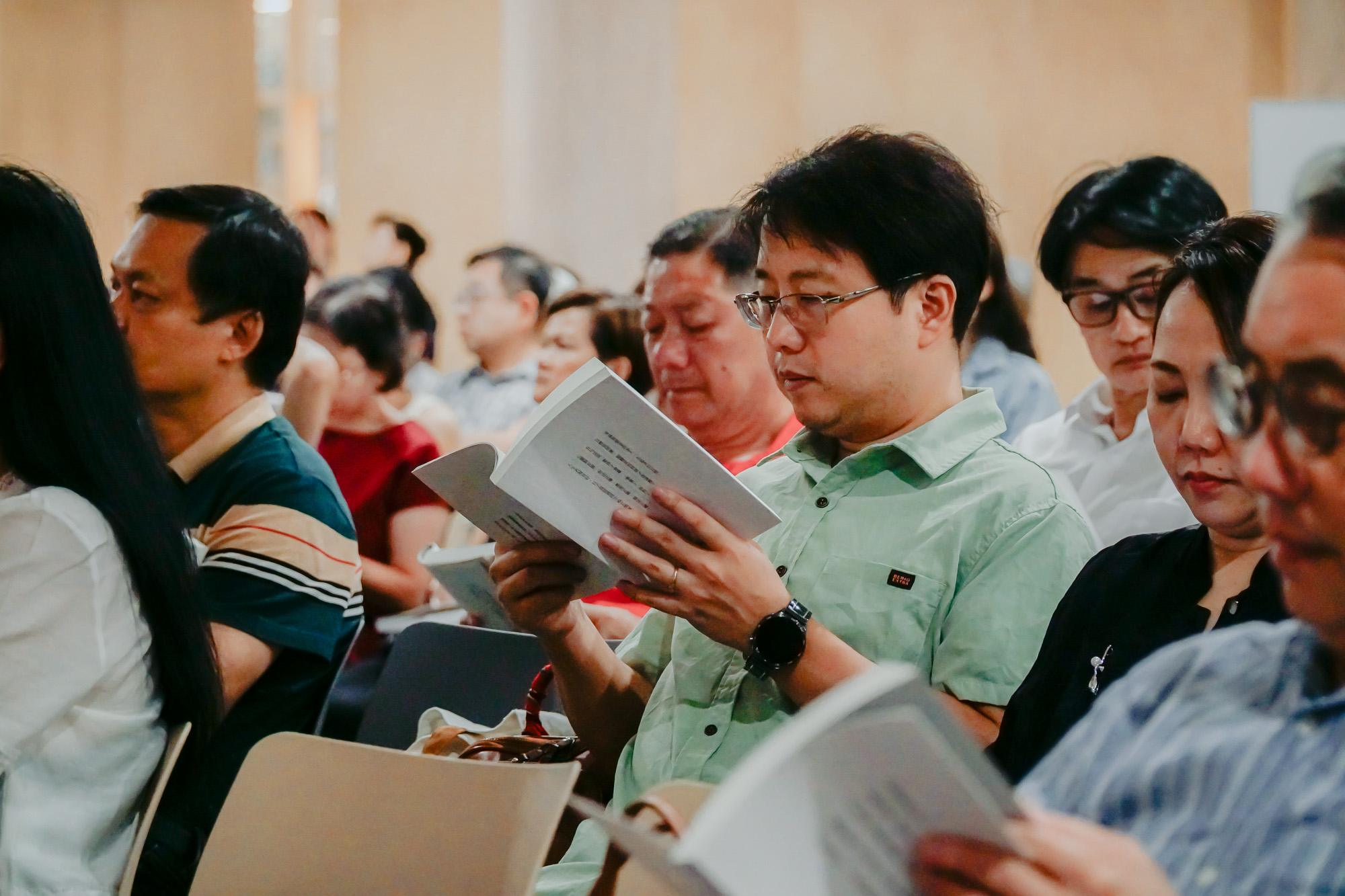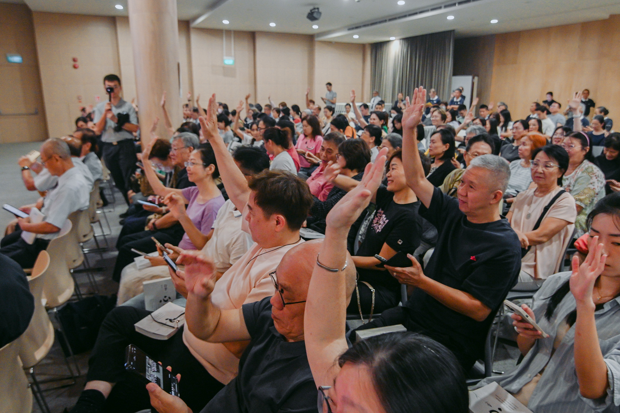 Audience members who raised their hands to scan the QR code and add the official “Friends of Da Ai” WhatsApp account received a small gift. (Photo by Tan Sam Ba)