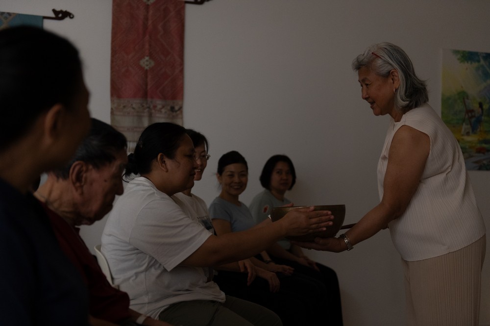 Our hearing is more acute in a dark environment. The therapy facilitator also invited participants to use their sense of touch to experience the resonance of singing bowls during the sound therapy. (Photo by Bong Kian Hin)