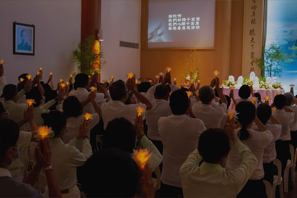 对实业家白允枝来说,浴佛典礼中最摄心的一刻,就是全场齐声唱诵《诚心祈三愿》,人人手中的心灯亮起之际,总是禁不住感动流泪。