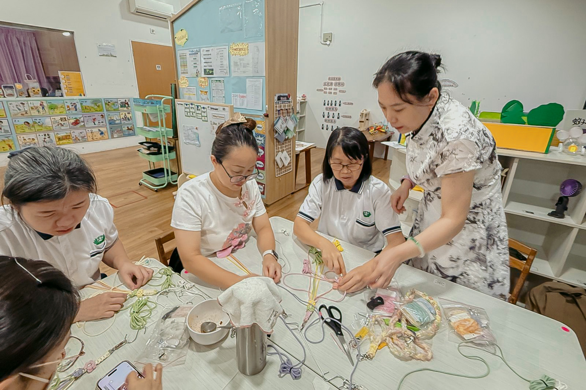 平日需一心多用的幼教老师们,此刻一心投入编织,享受片刻静谧。摄/ 杨粮恺